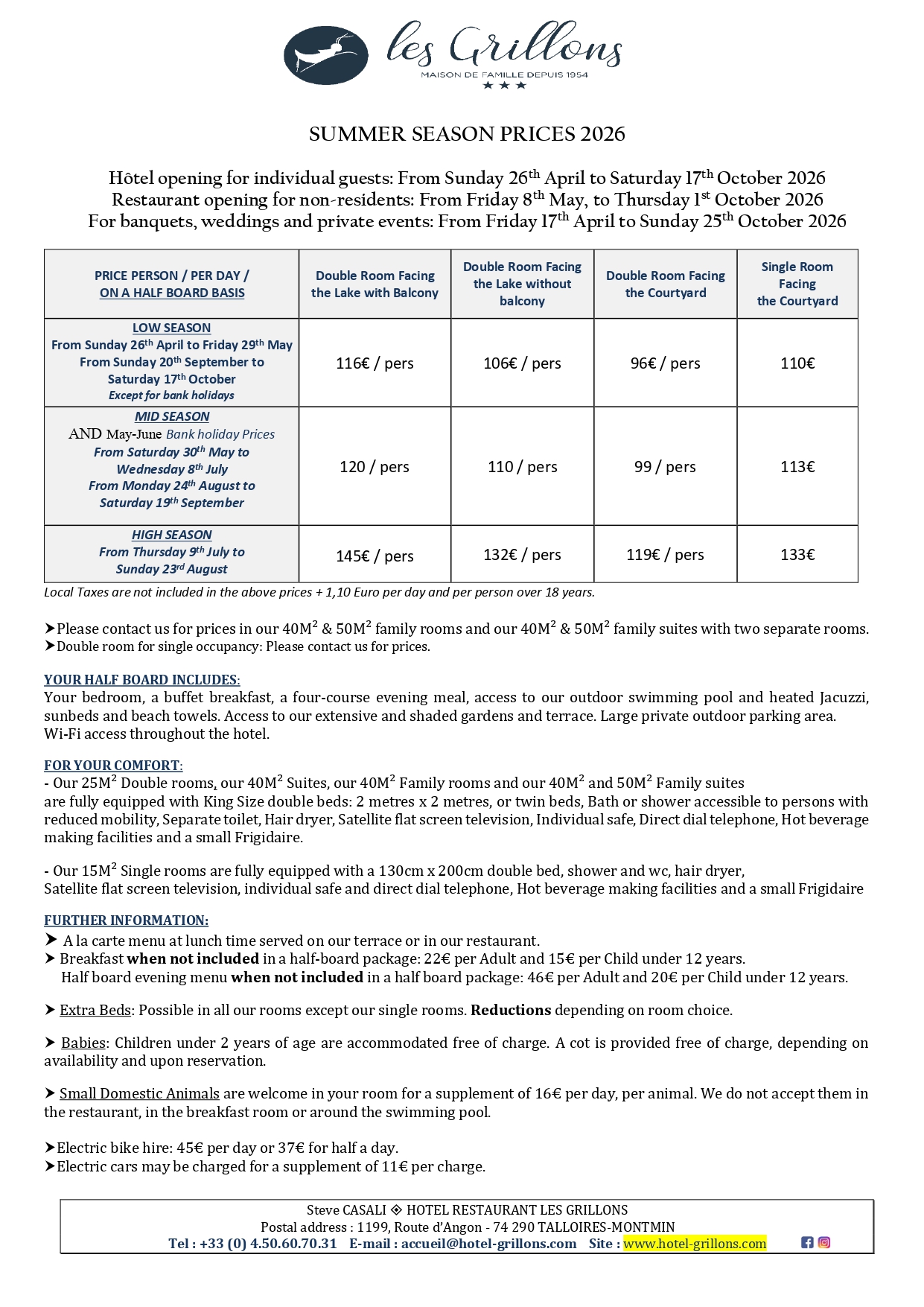 2026 Rates - Stay with half board